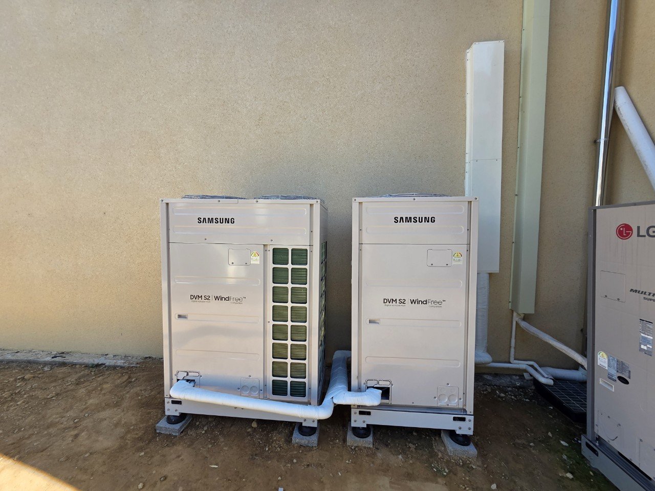 건물 외부에는 멀티 실외기를 나란히 배치해 통풍이 원활하고 유지보수 동선이 확보되도록 계획했습니다. 실외기 주변은 공기 흐름이 중요하기 때문에, 너무 밀집되지 않으면서도 관리가 편한 위치를 선택하는 것이 포인트입니다.