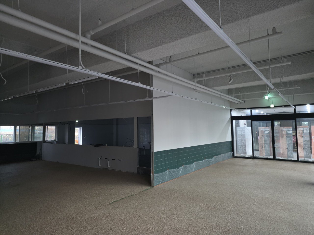 해당 상가는 넓은 홀 한 면이 통으로 트여 있고, 천장 마감이 전혀 되어 있지 않은 노출 천장 구조였습니다. 배관, 조명, 스프링클러가 그대로 드러나 있어 에어컨 배관과 실내기 위치가 인테리어에 미치는 영향이 상당히 큰 상황이었습니다.