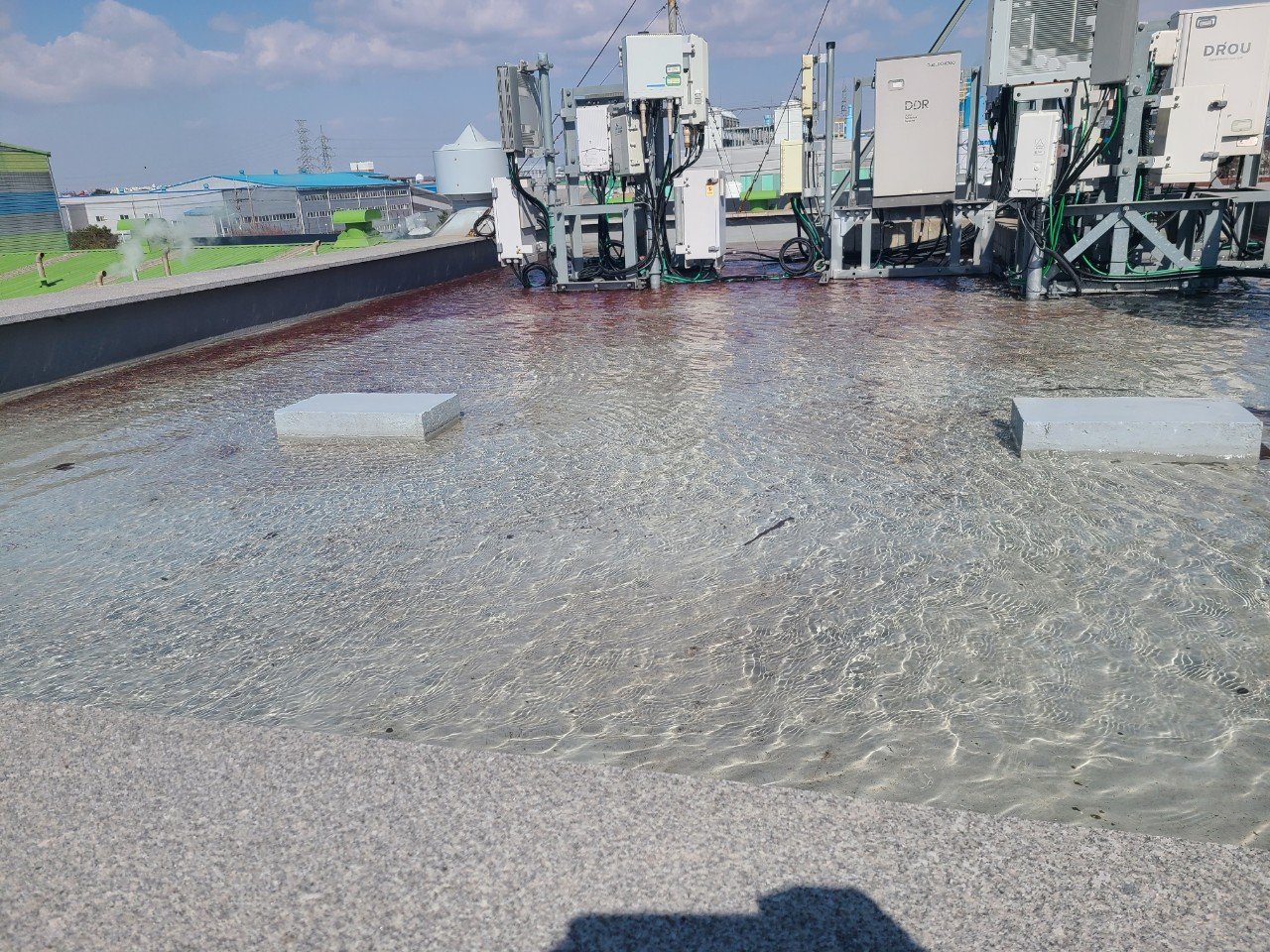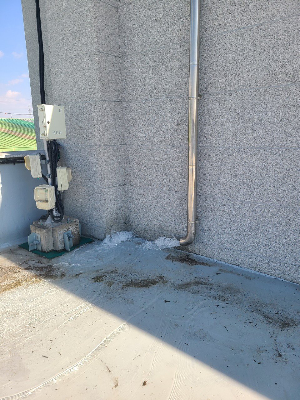 현장에서는 실제로 물이 고여 있던 구간과, 빗물이 타고 내려갈 수 있는 조건이 함께 확인되었습니다. 이 부분이 전기선 라인과 연결되면서, 내부로 유입된 빗물이 라인 안쪽을 따라 1층 식당 천장까지 이동한 것으로 판단되었습니다.