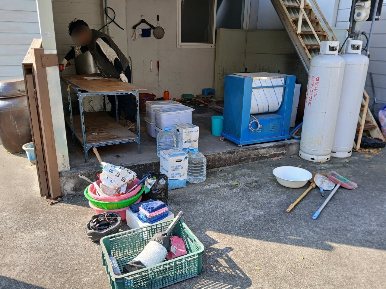 이 식당은 건물 뒤편에 작은 야외 작업장이 따로 마련되어 있었습니다. 국수집 특성상 선반과 용기, 각종 조리 도구들이 많이 쌓여 있었는데, 하나씩 확인하면서 분리 배출 작업을 진행했습니다.