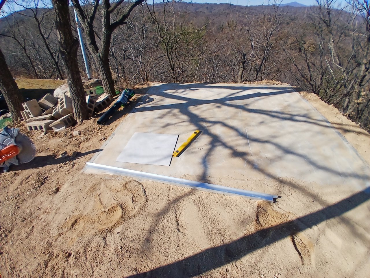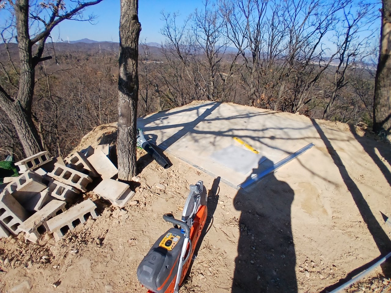 말로만 들으면 “콘크리트 조금만 잘라주면 되겠지” 싶은 작업이지만, 실제 야산 현장에 가보면 상황이 다릅니다. 주변 지형이 고르지 않아 장비를 옮기고 세팅하는 과정부터 쉽지 않고, 특히 이번 벙커 상부 콘크리트는 두께가 약 20cm에 달해 일반 공구로는 작업이 거의 불가능한 상태였습니다.