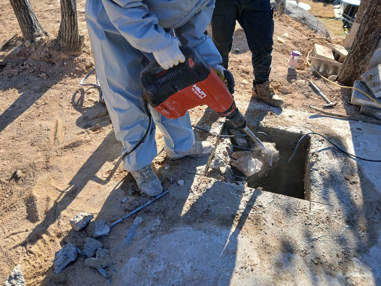 이번 벙커 상단 콘크리트는 두께가 약 20cm로 상당히 두꺼운 편이었습니다. 이런 두께를 한 번에 ‘쾅’ 하고 잘라내려 하면 장비에도 무리가 가고, 콘크리트에 예기치 않은 균열이 생길 수 있습니다.