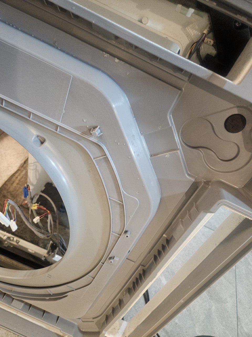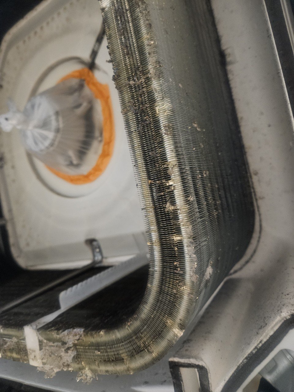 분해를 마치고 내부를 살펴보니, 열교환기 라인과 팬 주변, 패널 안쪽에 기름때가 섞인 먼지가 두껍게 붙어 있었습니다. 특히 모서리와 틈새 부분은 겉에서 전혀 보이지 않지만, 실제로는 오염이 가장 많이 몰려 있는 지점이었습니다.
