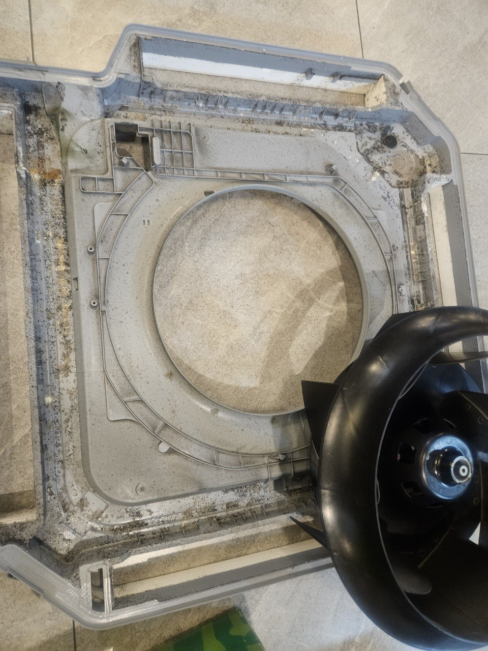 필터만 빼서 씻는 정도로는 해결이 되지 않기 때문에, 제품 전원을 차단한 뒤 외부 커버와 필터, 송풍팬 주변까지 분해하여 내부 상태를 꼼꼼하게 확인했습니다.