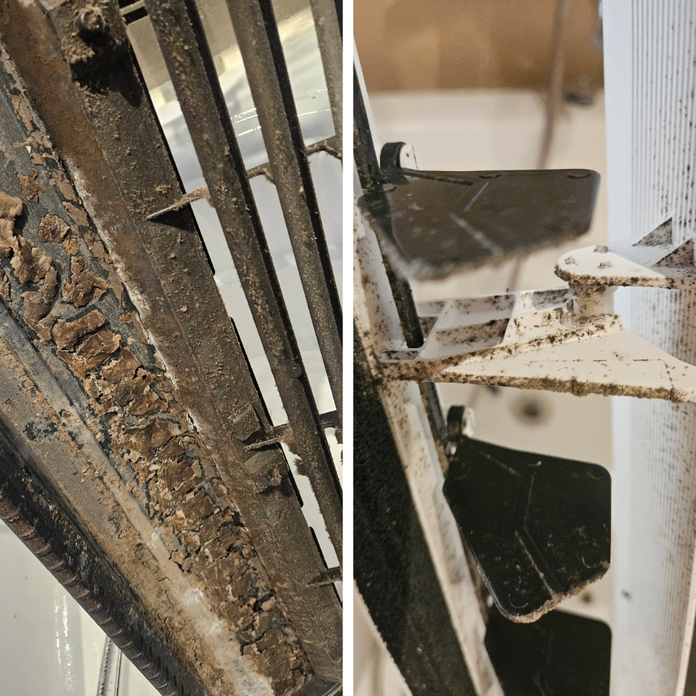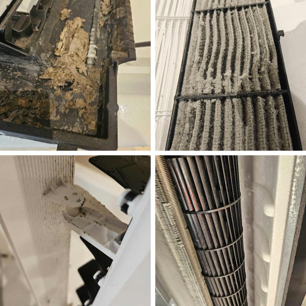 분해 후 확인해 보니, 필터에는 먼지가 두텁게 쌓여 있었고 내부 프레임과 드레인 쪽에는 물때와 오염이 상당 부분 진행된 상태였습니다. 이런 오염은 처음에는 눈에 잘 띄지 않지만, 시간이 지날수록 바람을 틀 때마다 냄새가 올라오고 냉방 효율을 떨어뜨리는 원인이 됩니다.