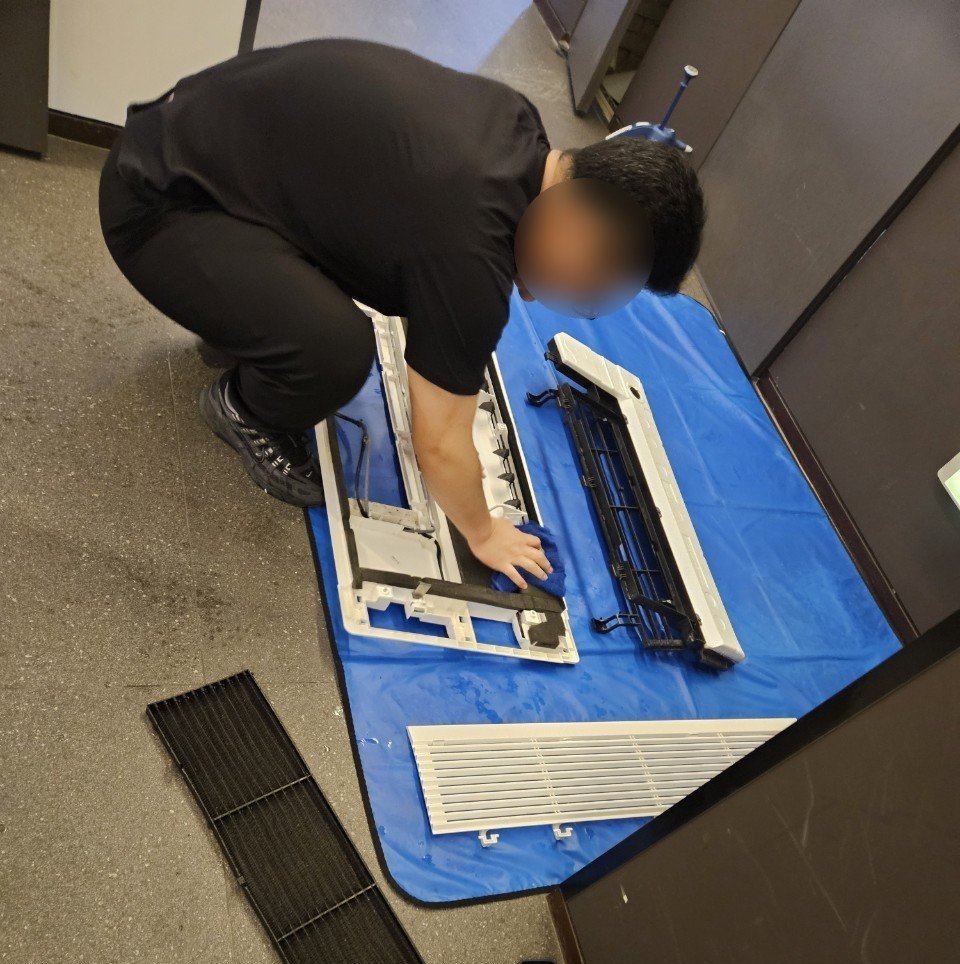 현장에 도착하면 가장 먼저 전원을 안전하게 차단하고, 에어컨 주변 바닥과 비품을 꼼꼼히 보양합니다. 분해세척 과정에서는 세척수와 오염물이 튈 수 있기 때문에, 전용 방수 커버를 단단히 설치해 벽지, 가구, 침구류가 오염되지 않도록 신경 씁니다.