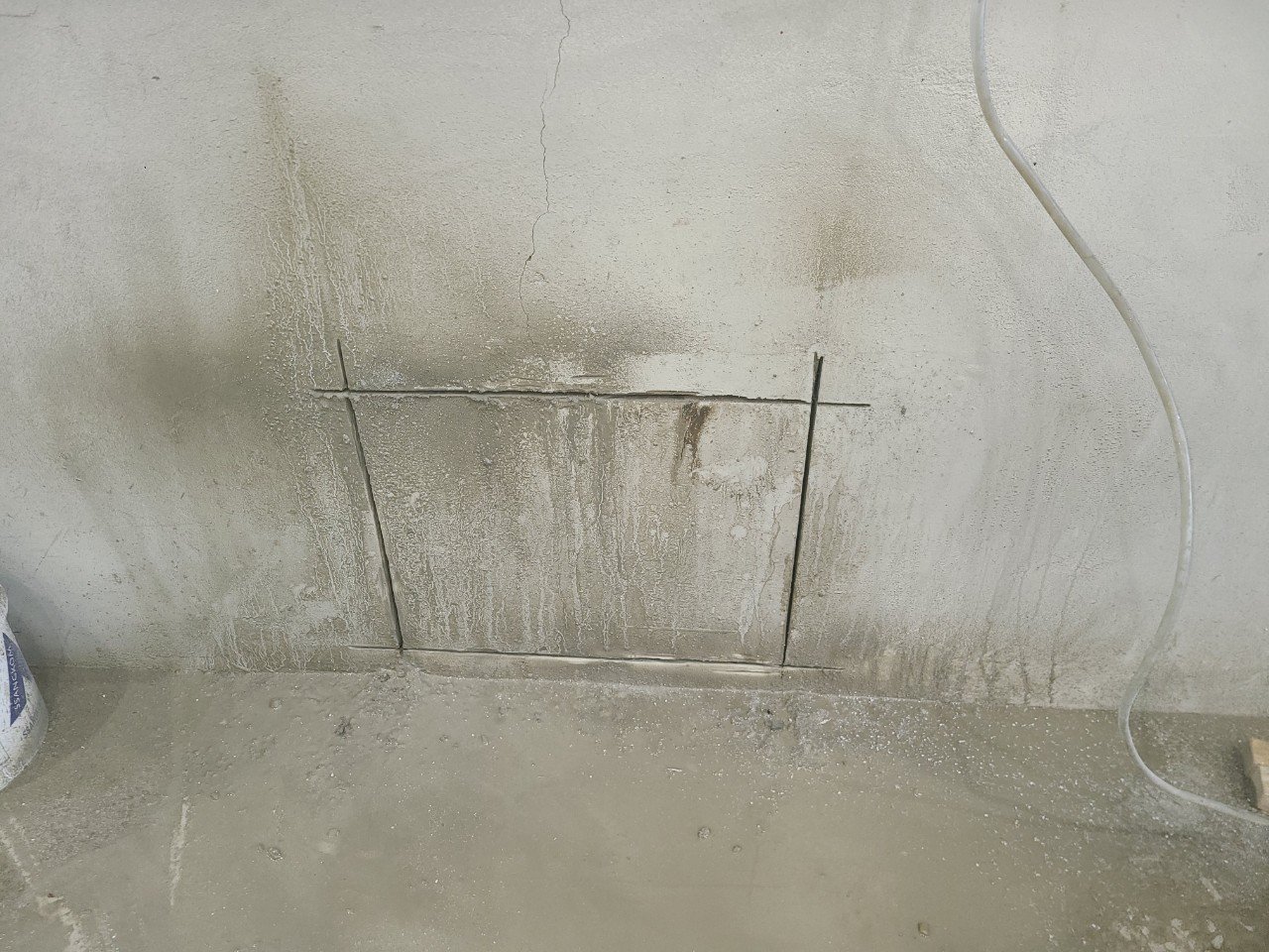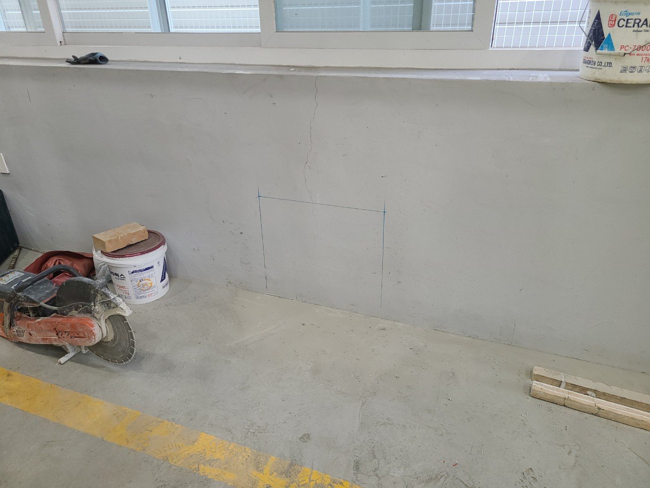 먼저 외벽 콘크리트 벽면에 컷팅이 들어갈 구간을 표시하는 작업부터 진행했습니다.