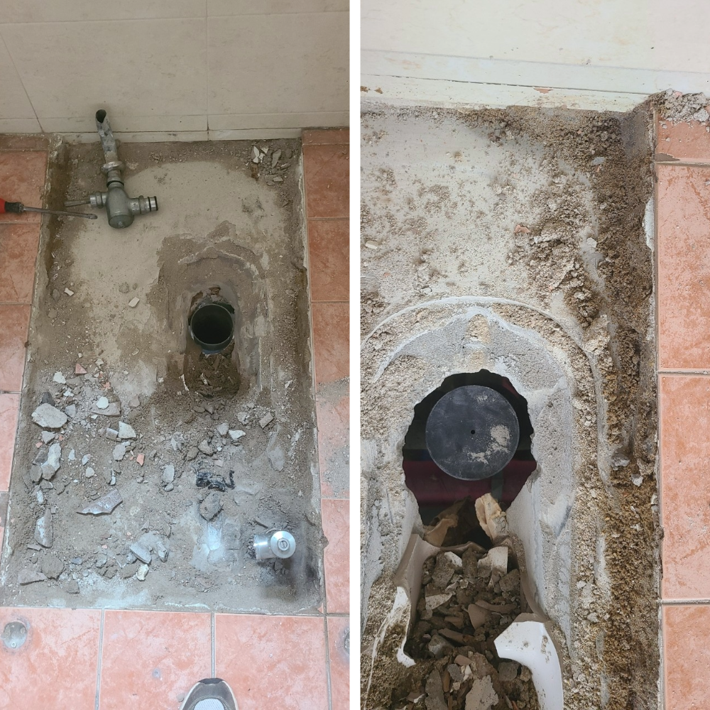 현장에서는 각 부스마다 기존 오수관의 위치를 하나씩 확인한 뒤, 양변기로 변경했을 때 배관 중심이 어디로 와야 하는지 치수를 세밀하게 잡았습니다.