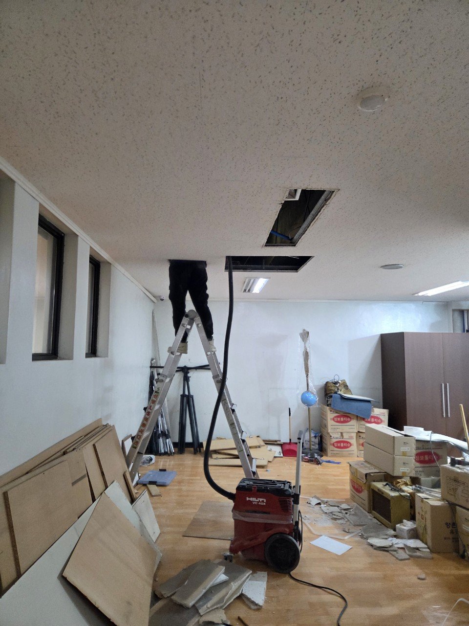 기존 천장재를 정리하고, 장비 설치와 향후 점검을 위한 점검구를 확보한 뒤 작업을 시작했습니다. 층고가 높다 보니 7단 사다리를 최대 높이까지 올려야 했고, 좁은 공간에서 사다리를 세운 상태로 천장 내부 배관을 연결해야 하는 상황이라 안전을 최우선으로 진행했습니다.