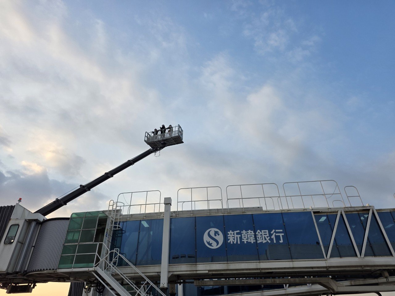 김포공항 탑승교는 지상과 상당한 높이 차이가 있는 구조라 일반 상가나 사무실처럼 쉽게 접근할 수 있는 현장이 아니었습니다. 안전을 최우선으로 해야 했기 때문에 크레인과 작업대를 함께 활용해 작업 위치에 접근했고, 작업자는 모두 안전벨트와 구명줄을 착용한 상태에서 이동 동선을 하나씩 점검하며 진행했습니다.