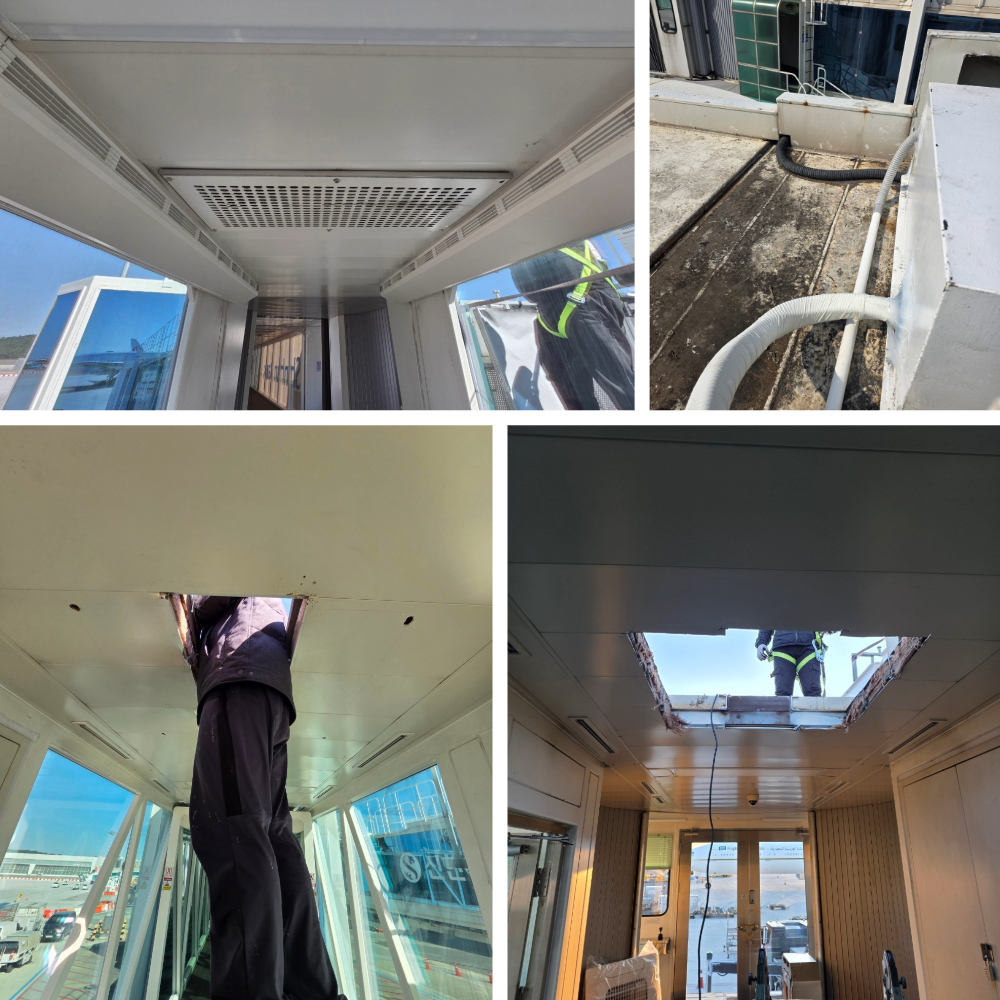 냉방과 난방 전환이 정상적으로 이루어지는지, 풍량이 탑승교 전체에 고르게 전달되는지, 배수 상태에 문제는 없는지 항목별로 하나씩 체크했습니다. 시운전 결과 탑승교 전 구간에서 바람이 고르게 퍼지고, 설정 온도에 맞춰 실내 온도가 안정적으로 유지되는 것을 확인했습니다.
