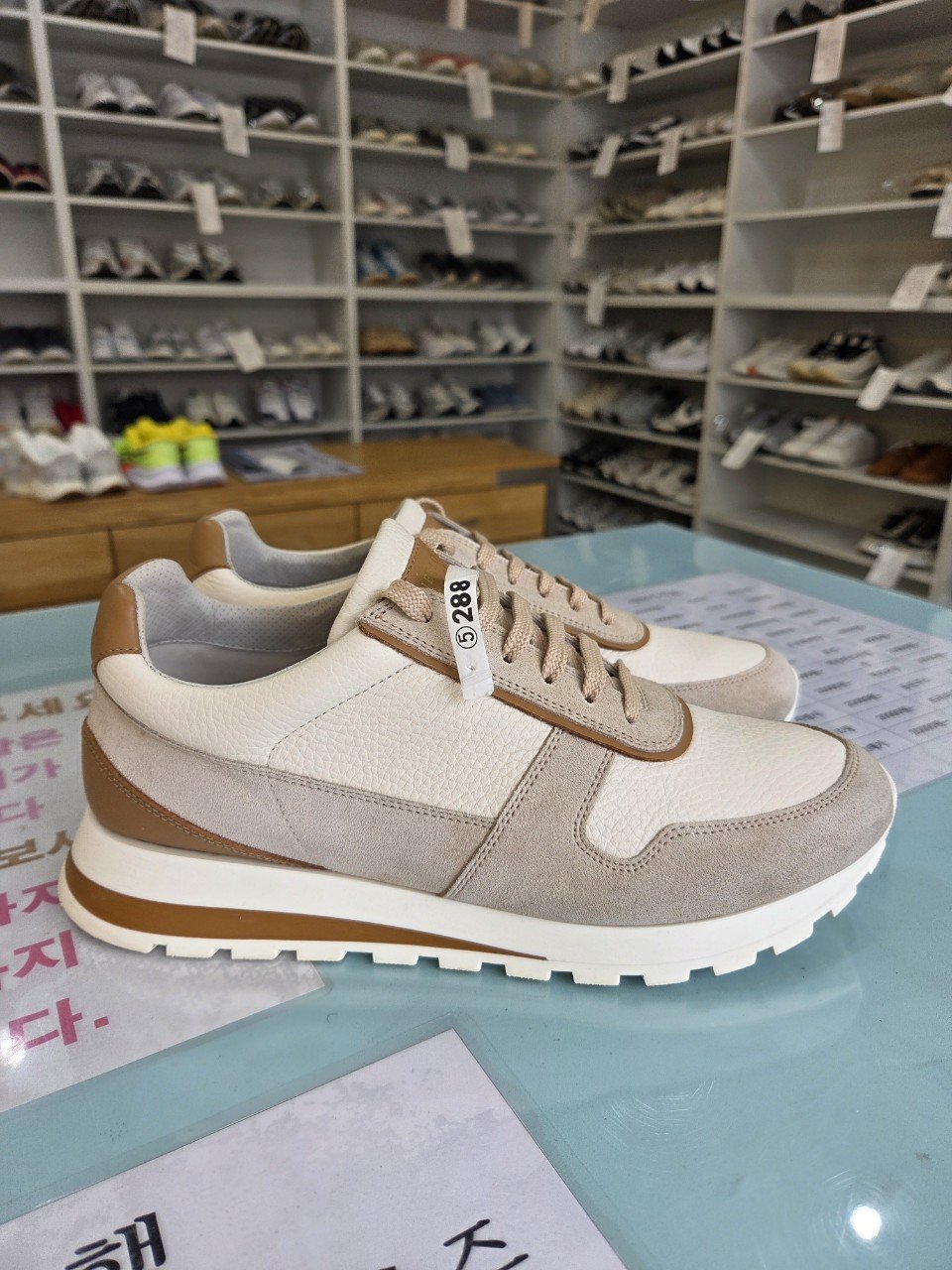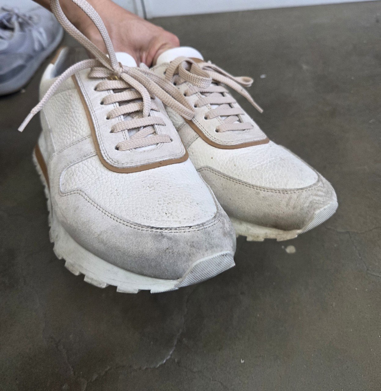오늘은 고급 스니커즈 의뢰 현장을 공유해요. 주인공은 브루넬로 쿠치넬리 스니커즈로, 가죽과 스웨이드가 혼합된 모델입니다. 고객님께서 소중히 신으셨지만 전체적인 생활오염이 쌓였고, 특히 앞코 스웨이드가 검게 변해 세탁을 요청해 주셨어요.