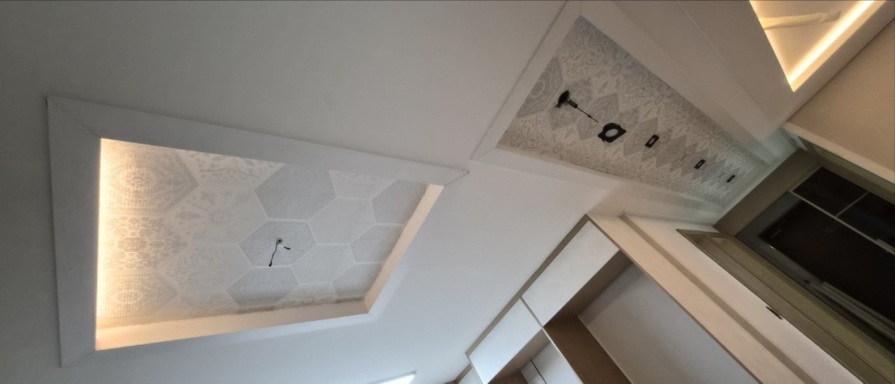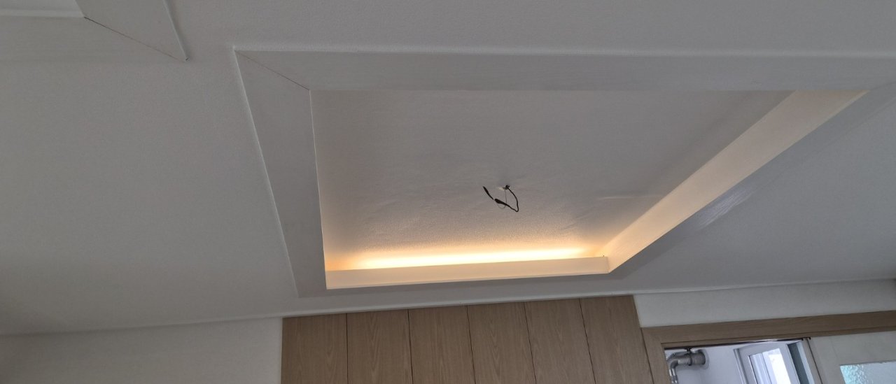 이번 현장은 특히 우물천장이 여러 개 있는 구조라 작업 난이도가 높은 편이었습니다. 우물천장은 모서리 라인과 단차가 많아서 조금만 재단이 어긋나도 그림자가 생기며 티가 납니다.