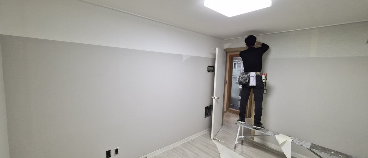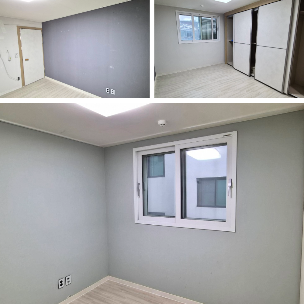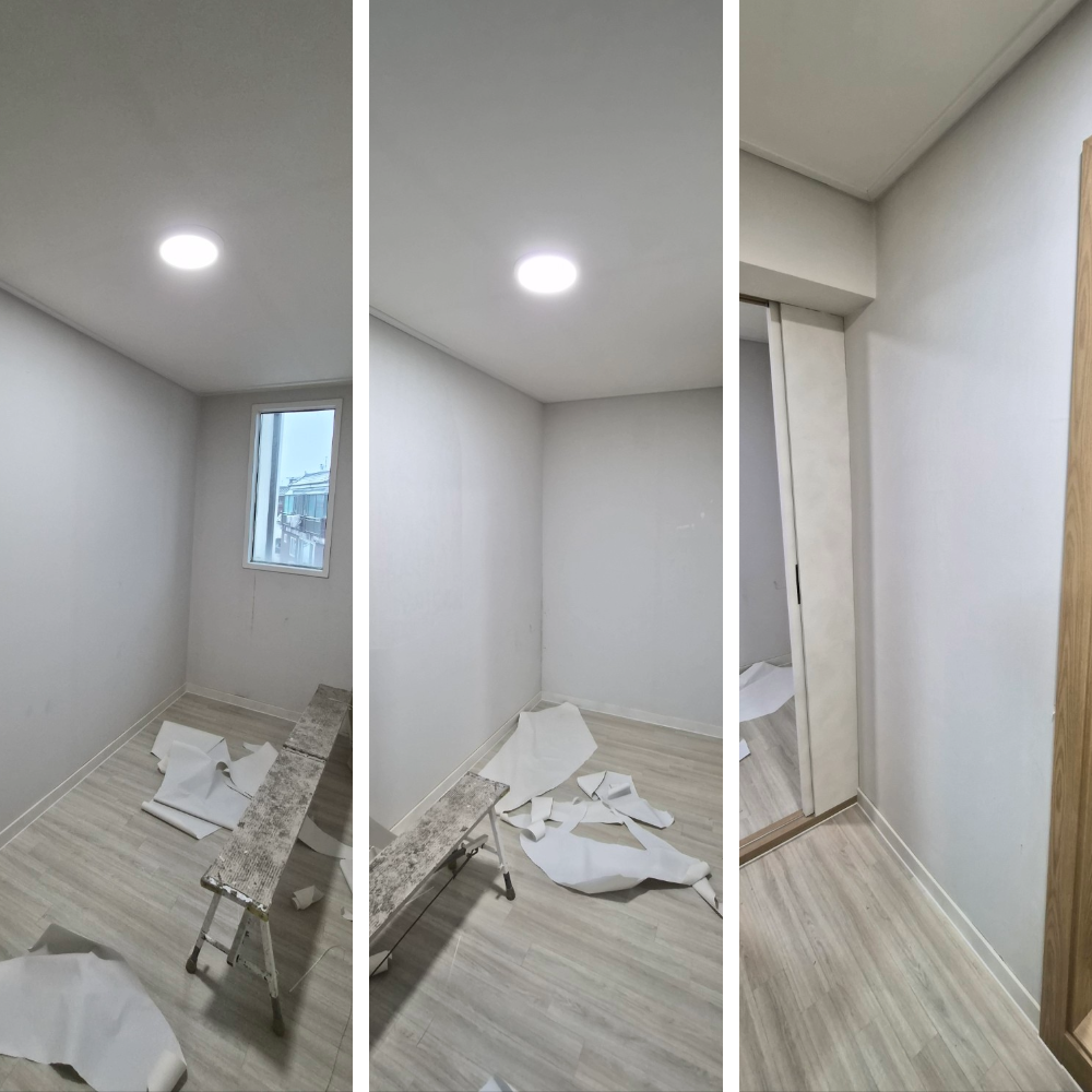 이번 장안동 3룸 빌라도 도배가 끝나자마자 전체적으로 한 톤 밝아진 느낌이 났고, 방과 거실 모두 정리된 인상을 주었습니다. 벽지가 깨끗해지니 바닥과 천장, 몰딩까지 같이 정리된 것처럼 보여 집이 훨씬 넓고 쾌적해 보였습니다.