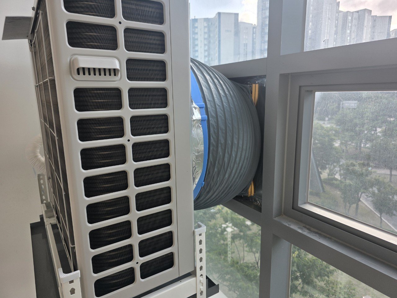 실외기실은 협소하고 통풍이 불리한 구조였기에 그대로 두면 효율 저하가 예상됐습니다. 그래서 에어로드를 실외기에 장착해 흡·배기 흐름을 분리하고 막힘 없이 빠져나가도록 유도했습니다. 진동 패드와 앵글 보강으로 공진도 줄였고요.