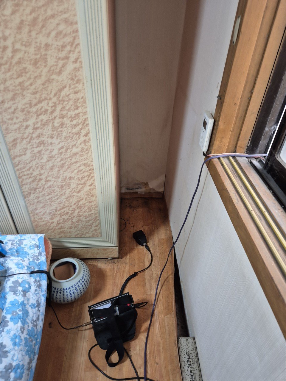 다음으로 청음 탐지기를 이용해 배관 동선을 따라 소음을 정밀 체크했습니다. 배관의 미세한 누수음은 바닥을 통해 전달되는데, 숙련된 기술자가 청음 포인트를 좁혀가며 소리의 강약과 특성을 구분합니다. 이번 현장에서는 안방 구석 바닥에서 특유의 “지직”하는 미세 누수음이 또렷하게 포착되어 지점을 특정할 수 있었습니다.