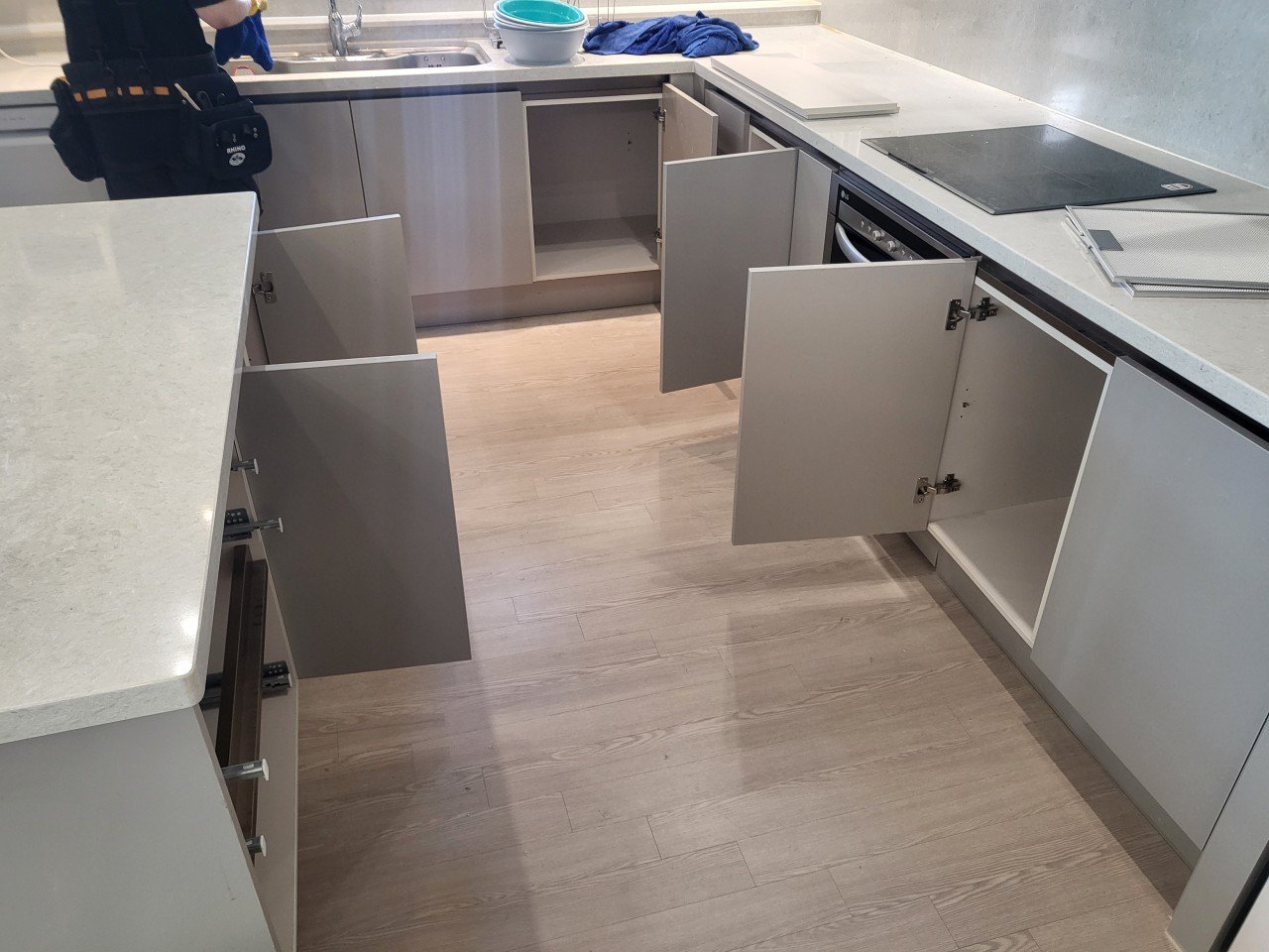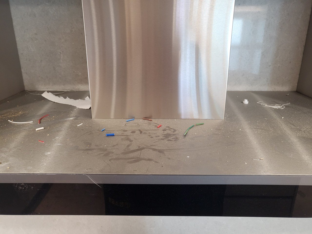 겉면만 훑어보면 티가 잘 안 나지만, 상부장 윗면과 싱크대 서랍 내부, 창틀 틈새, 간접조명 안쪽, 타일 줄눈 사이에는 미세먼지가 고르게 쌓여 있었습니다. 특히 장갑 스친 자국과 접착제 미세 잔사가 주방 주변에 남아 있어 세심한 클리닝이 필요했어요.