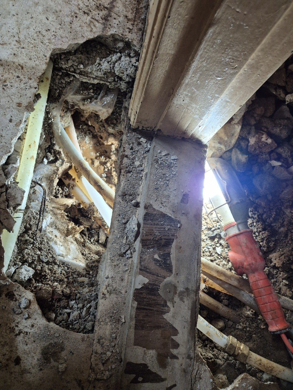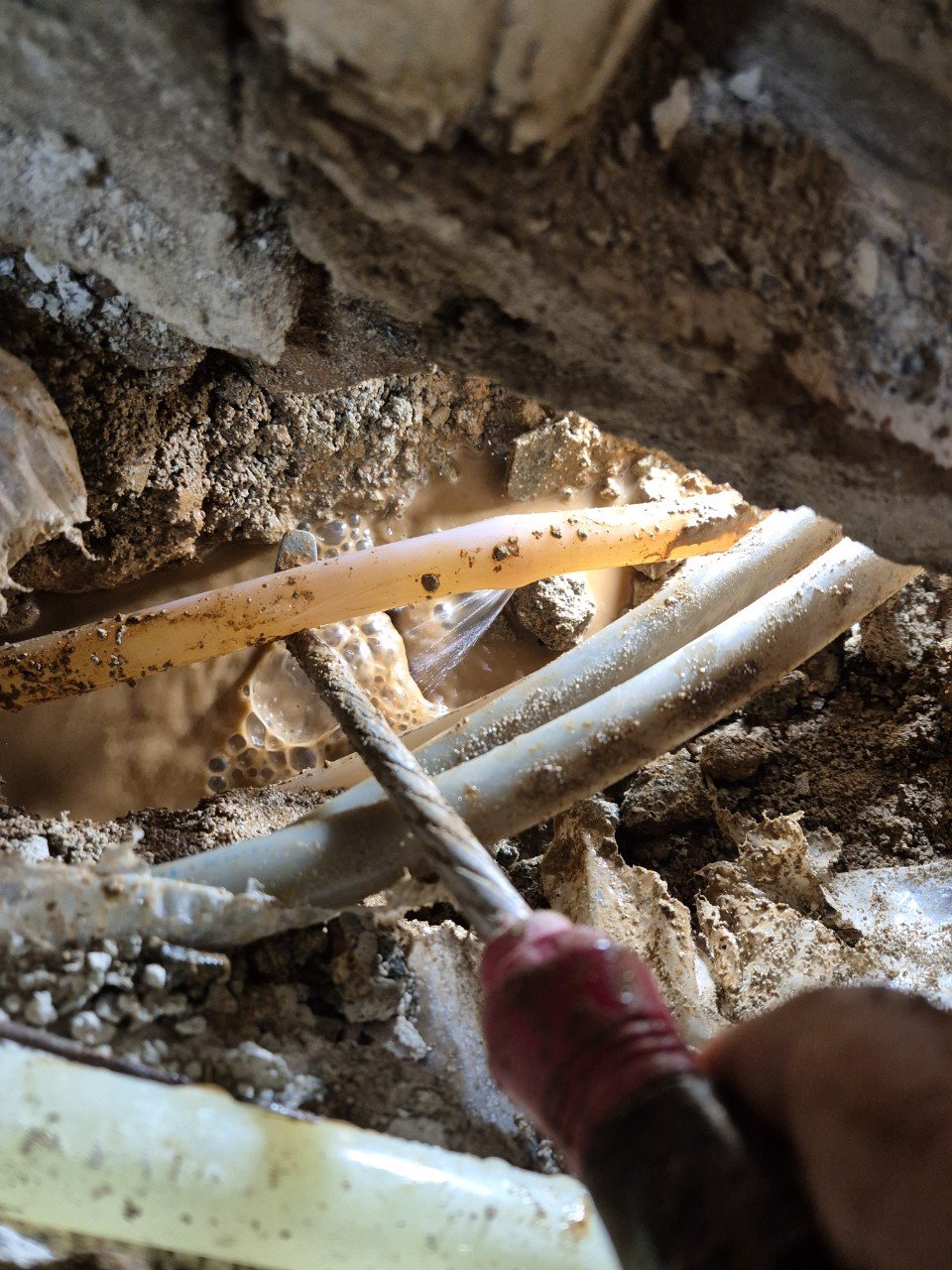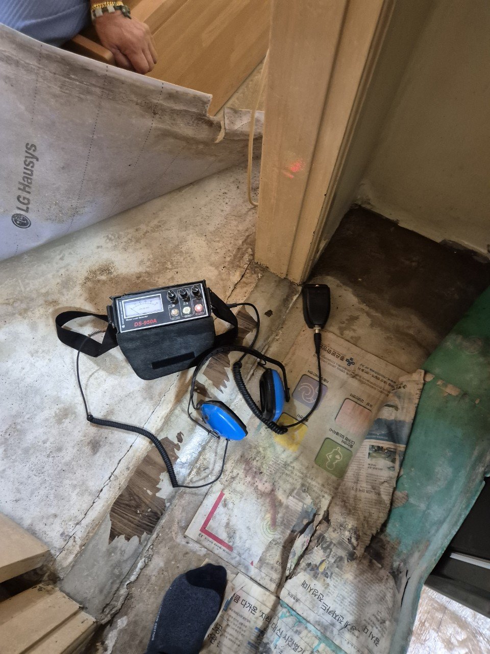 정확도를 높이기 위해 청음탐지기로 소음을 추적했습니다. 부엌 근처 바닥 하부에서 특유의 누수음이 뚜렷하게 포착되어 위치를 표기했고, 마감 손상을 최소화하는 선택 굴착을 진행했습니다. 굴착 직후 배관 연결 부에서 물이 분출하는 것이 확인되었고, 노후된 플라스틱 배관에 미세 균열이 생긴 상태였습니다.
