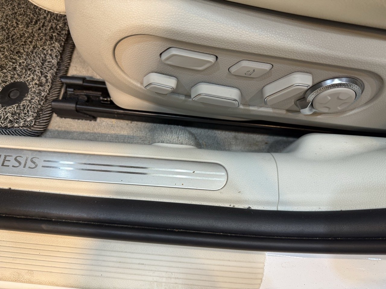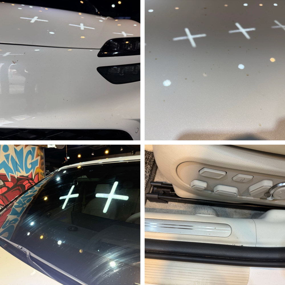 화이트 펄 컬러 특성상 오염이 눈에 띄는 편이라, 입고 시 보닛과 루프, 범퍼에 벌레 자국과 타르, 물때가 보였고 유리면에는 와이퍼 얼룩이 남아 있었습니다. 실내는 승하차가 잦은 하단 몰딩에 때가 누적되어 있었고, 가죽 시트 주변 틈새에는 먼지와 이물질이 쌓여 있었어요.