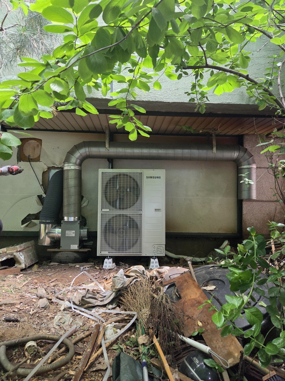 실외기 예정 위치가 흙바닥이라 그대로 두면 진동·소음과 수평 불량 문제가 생기기 쉬운 조건이었습니다. 먼저 바닥을 평탄화하고 지지력을 확보한 뒤, 받침대와 방진패드를 적용해 안정적으로 고정했습니다.