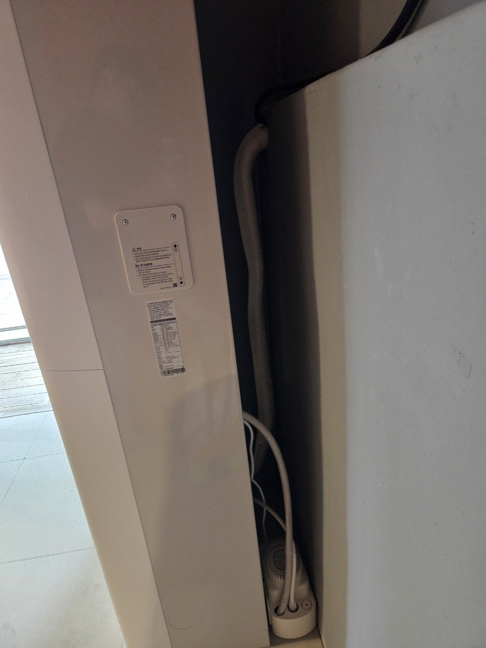 현장 구조상 실내기에서 자연 배수가 어려워 응축수가 고일 우려가 있었습니다. 이를 해결하기 위해 실내기 뒤편에 배수펌프를 설치하고, 상부 벽면 배관홀을 통해 외부로 안정적으로 배출되도록 라인을 구성했습니다.