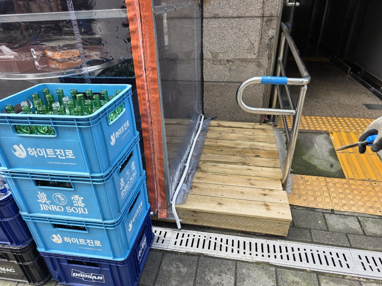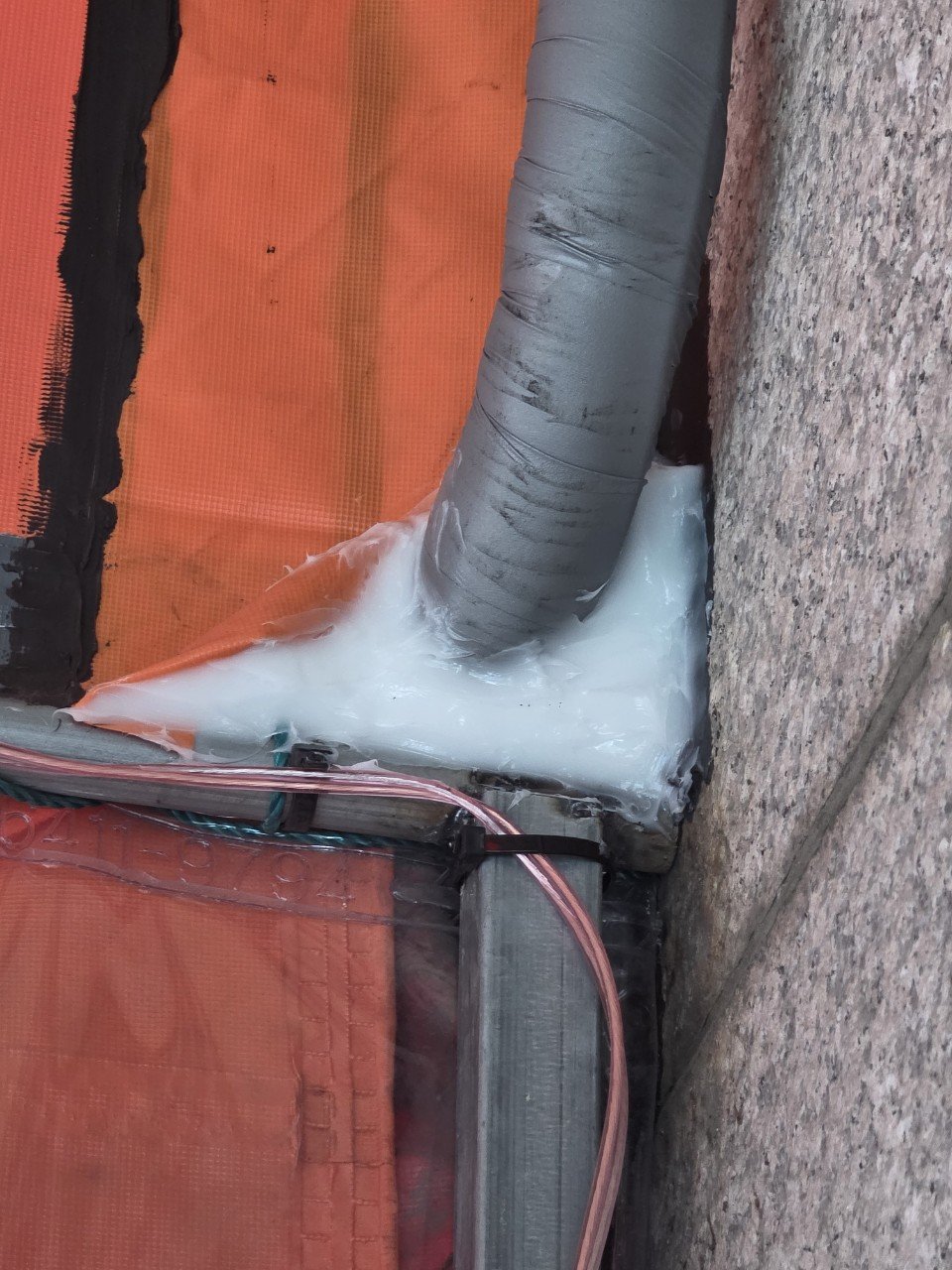 - 배수 라인: 출입문 옆 유리 천장 하부를 따라 배수 배관을 배치하고 결속 밴드와 실리콘으로 마감선을 깔끔하게 정리