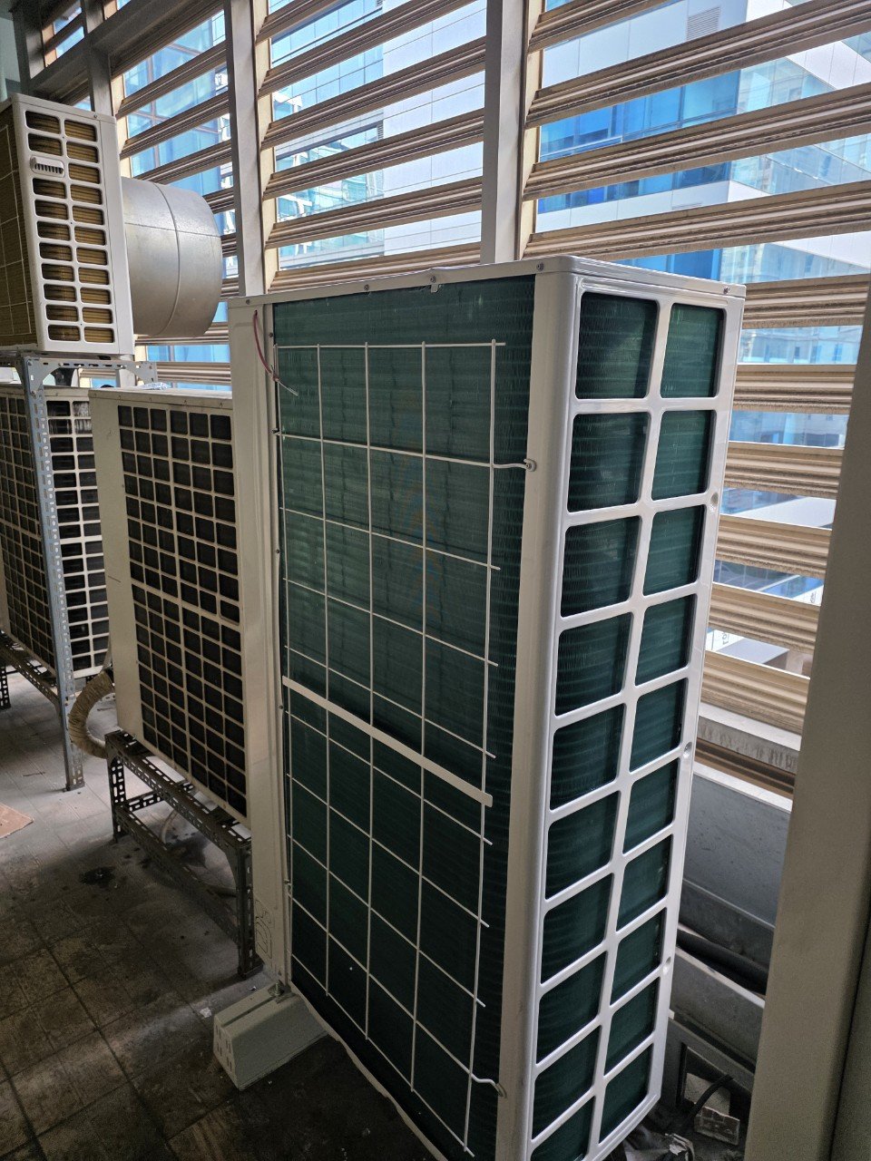 실외기실에는 대형 시스템 에어컨 실외기를 새로 배치했습니다. 우선 통풍이 원활한 위치를 선정해 열이 잘 빠져나갈 수 있도록 했고, 운전 시 발생하는 진동을 줄이기 위해 방진 패드를 사용해 베이스를 잡았습니다.