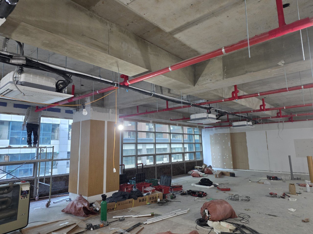현장은 넓은 오픈 사무실 공간에 회의실과 휴게 공간이 함께 구성된 구조였습니다. 전체 천장은 백색으로 도장한 뒤 천장재 없이 노출로 마감하는 계획이었고, 그만큼 에어컨 실내기와 배관이 그대로 눈에 보이는 환경이었습니다.