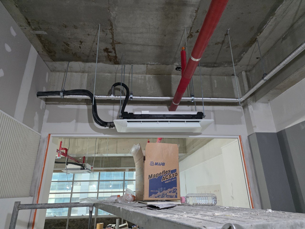 이렇게 설치해 두면 사무실에서 위를 올려다보았을 때 실내기와 천장 구조물이 일정한 라인을 이루게 되고, 전반적인 인테리어 완성도가 훨씬 좋아집니다. 단순히 냉난방 장비를 거는 수준이 아니라, 인테리어 요소를 배치한다는 생각으로 작업을 진행했습니다.