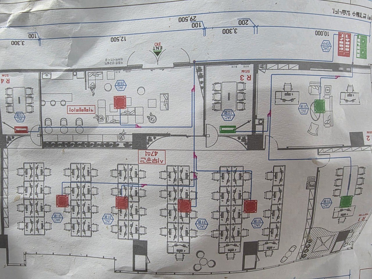 이후 도면을 기반으로 소방 배관, 전기 트레이, 조명 위치를 하나씩 확인하면서 실내기 위치를 조정했습니다. 노출 천장에서는 조금만 겹치더라도 시야에 어수선하게 보일 수 있기 때문에, 서로 간섭이 생기지 않도록 거리를 확보하는 것이 중요합니다.