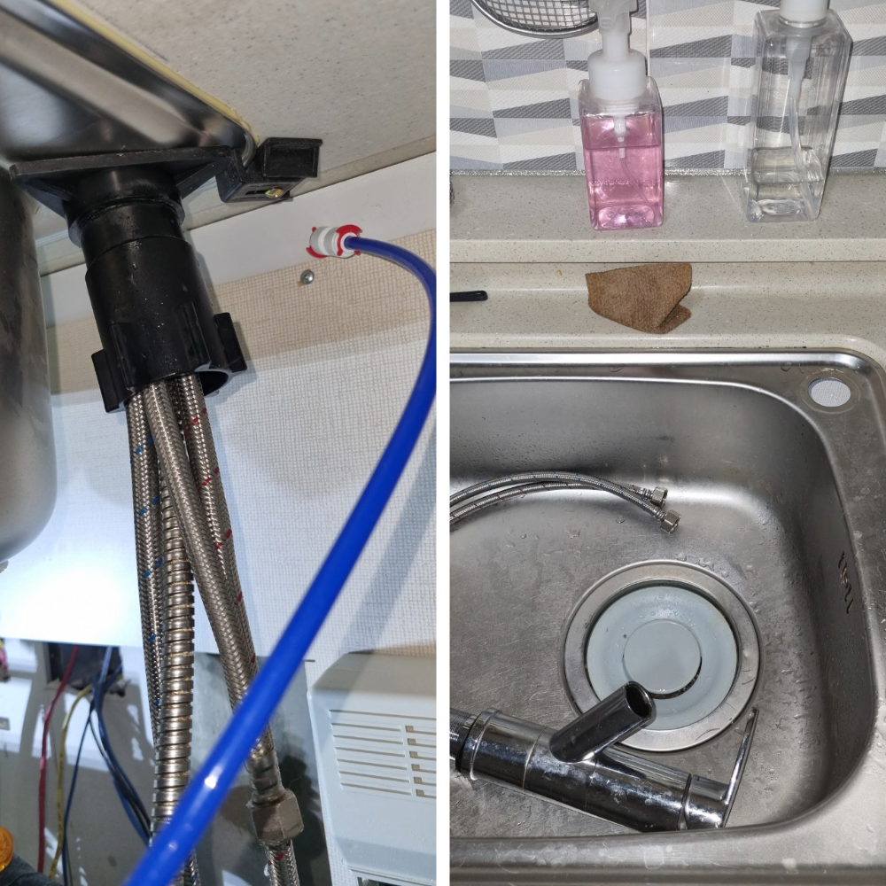 그 다음 싱크대 아래쪽에서 고정 역할을 하던 브래킷과 너트를 풀어 기존 수전을 분리했습니다. 오래 사용하던 제품이다 보니 씽크홀 주변 실리콘이 굳어있고, 일부는 변색과 녹이 함께 보이는 상태였습니다.