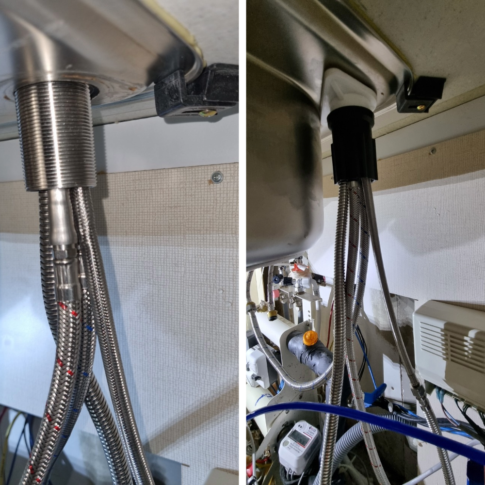 새 수전을 설치하기 위해 온수와 냉수 호스를 규격에 맞는 어댑터로 연결했습니다. 이때 호스가 필요 이상으로 꼬이지 않도록 방향을 조정하고, 사용 중 장력이 가해지지 않게 라우팅을 다시 잡아 주었습니다.