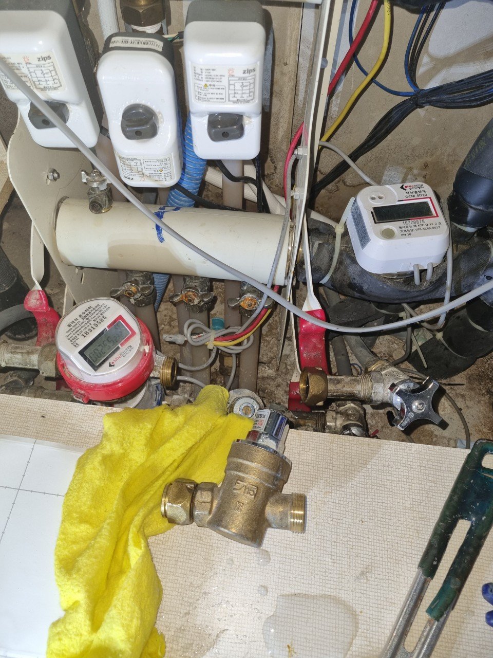 우선 작업 구역을 정리하고 흡수포를 깔아 혹시 모를 2차 물 피해를 막았습니다. 배관 쪽 작업은 작은 물 튐에도 주변이 젖을 수 있기 때문에, 시작 단계에서부터 정리와 보호 조치를 제대로 해두는 것이 중요합니다.