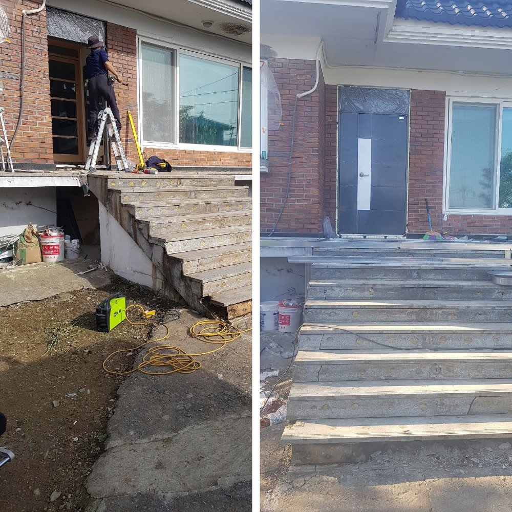 오늘은 용인 시골마을 주택 현장에서 단열방화문, 방부목 데크, 난간, 렉산 지붕을 한 번에 진행한 작업 후기를 전해드립니다. 기존 진입 계단의 대리석이 노후되어 미끄럼과 파손이 걱정되는 상태였고, 외기와 맞닿은 현관의 냉·난방 손실도 큰 편이라 구조 보강과 단열 개선이 핵심 과제였습니다.