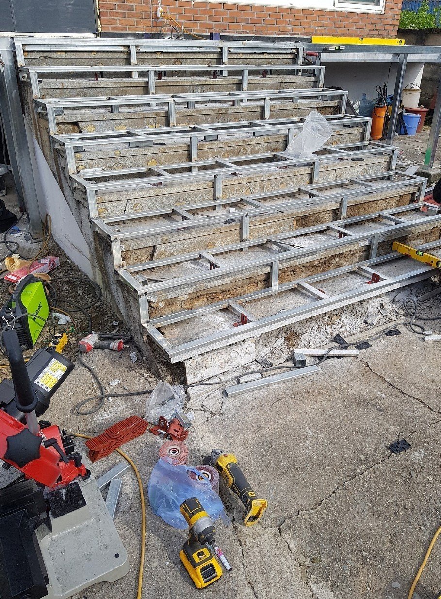 • 기존 콘크리트 위에 철제 하부 프레임 신규 제작, 용접 후 아연도장으로 부식 방지