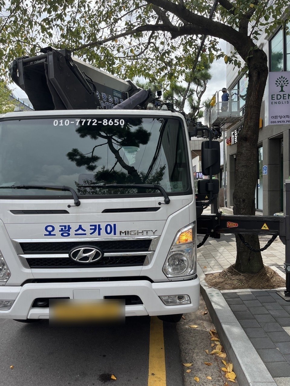 현장은 전기줄과 가로수가 얽혀 있어 작업 공간이 넉넉하지 않았습니다. 이에 높이와 작업 폭을 고려해 3.5톤 스카이차를 투입했고, 차량 위치를 수차례 미세 조정하며 안전거리를 확보했습니다. 높은 곳에서의 시트지 부착은 작은 흔들림에도 오차가 생길 수 있어, 무전으로 신호를 주고받으며 붐 각도와 바스켓 위치를 세밀하게 맞췄습니다.