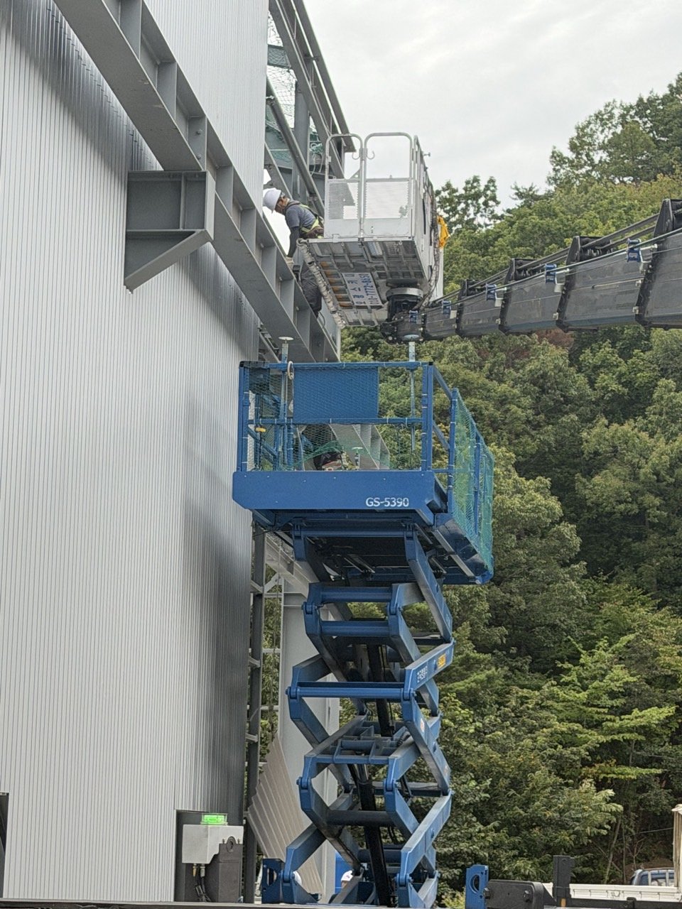 외벽 칼라강판처럼 두 손을 모두 써야 하는 작업은 사다리보다 스카이차가 훨씬 안정적입니다. 바스켓에는 안전난간과 비상정지 장치가 있어 자세를 유지한 채 작업에 집중할 수 있고, 붐대 미세 조정으로 작업 각도와 거리를 정확히 맞출 수 있습니다. 특히 코너부나 개구부 주변처럼 접근이 까다로운 위치에서도 작업자의 시야와 동선을 확보해 품질과 안전을 동시에 챙길 수 있었어요.