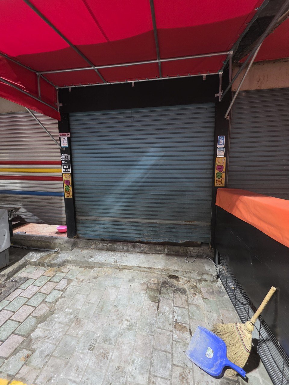 내부 철거와 폐기물 정리를 마무리한 후에는 출입구 쪽 작업까지 함께 진행했습니다. 이 상가는 외부 천막 제작·설치까지 포함된 현장이었기 때문에, 철거 동선과 설치 동선이 서로 겹치지 않도록 순서를 조정하는 것이 중요했습니다.
