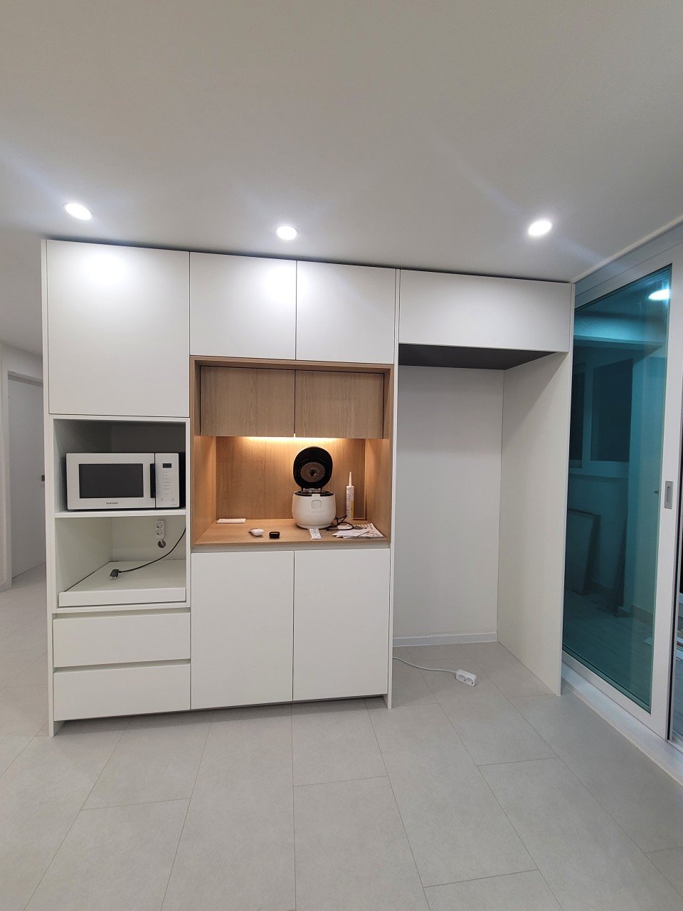 베이스는 화이트 톤으로 잡고, 우드 포인트를 더해 차갑지 않은 분위기를 만들었습니다. 화이트와 우드 조합은 주방에서 특히 안정적으로 오래가는 조합이라, 전체 집의 느낌도 한층 편안해 보이게 해 줍니다.