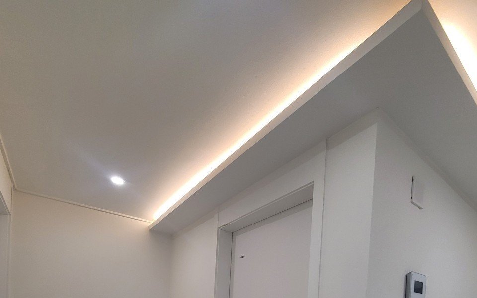 조명 계획도 다시 잡았습니다. 천장에는 매립등을 촘촘하게 배치해 어두운 구석이 남지 않도록 했고, 긴 간접조명 라인을 과하지 않게 넣어 밤에는 부드러운 분위기가 만들어지도록 조율했습니다. 거실처럼 큰 공간은 조명 위치와 밝기 하나만 어긋나도 피곤해 보일 수 있기 때문에, 빛이 고르게 퍼지는 균형을 특히 신경 썼습니다.