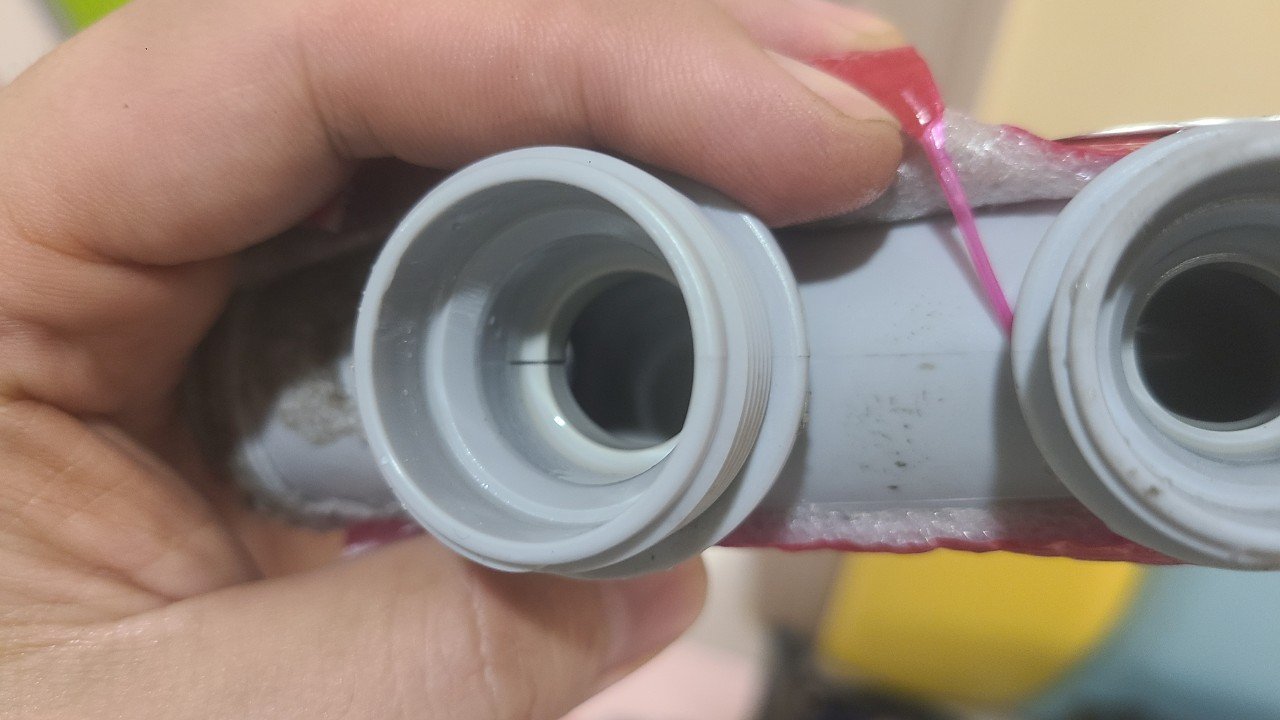 원인은 특정 포트 하우징의 미세한 ‘실금’이었습니다. 육안으로도 실선처럼 보였고, 확대해 보니 균열이 길게 퍼져 물길이 만들어진 상태였죠. 이런 실금은 온수의 반복적인 열팽창/수축과 압력 변화, 과거의 과도한 체결 토크 등이 겹치면 점점 커지기 쉽습니다.